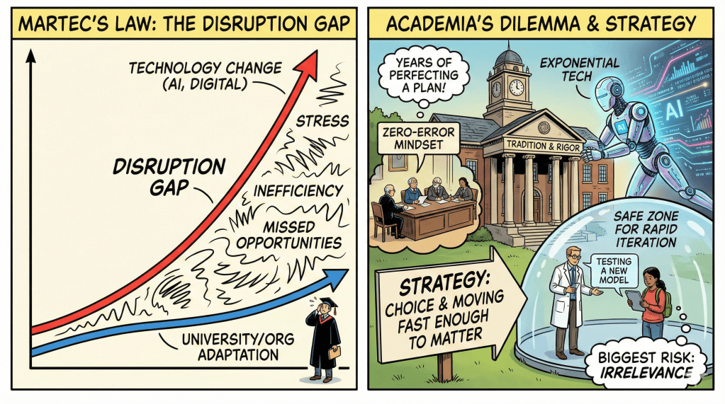 In many ways, this is our strength. We are the guardians of knowledge, and we shouldn’t be swayed by every fleeting trend. But Martec’s Law poses a unique threat to us in the 21st century. The AI technology we need to use and educate (and the technology our students will face in the workforce) is scaling exponentially. Meanwhile, our decision-making processes remain linear.