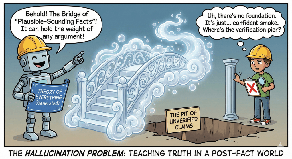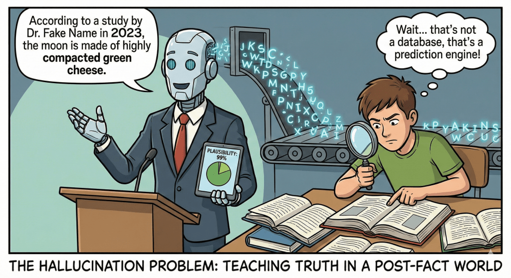 When a student uses AI to research a topic they don’t understand, they fall into the Plausibility Trap. The AI explains a concept so clearly and confidently that the student accepts it as fact. This erodes the foundation of critical thinking: verification.