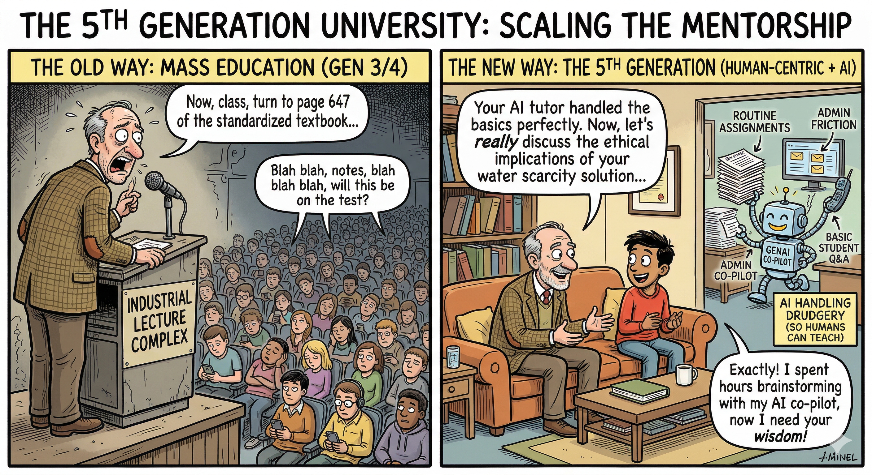In this post of Authentic Intelligence, we look to the horizon. We are moving beyond the 4th Generation University (which focused on networks and societal challenges) into the 5th Generation University. In this new era, Generative AI acts as an invisible enabler, allowing us to finally put the student and the student-mentor relationship back at the absolute center of the learning process.
